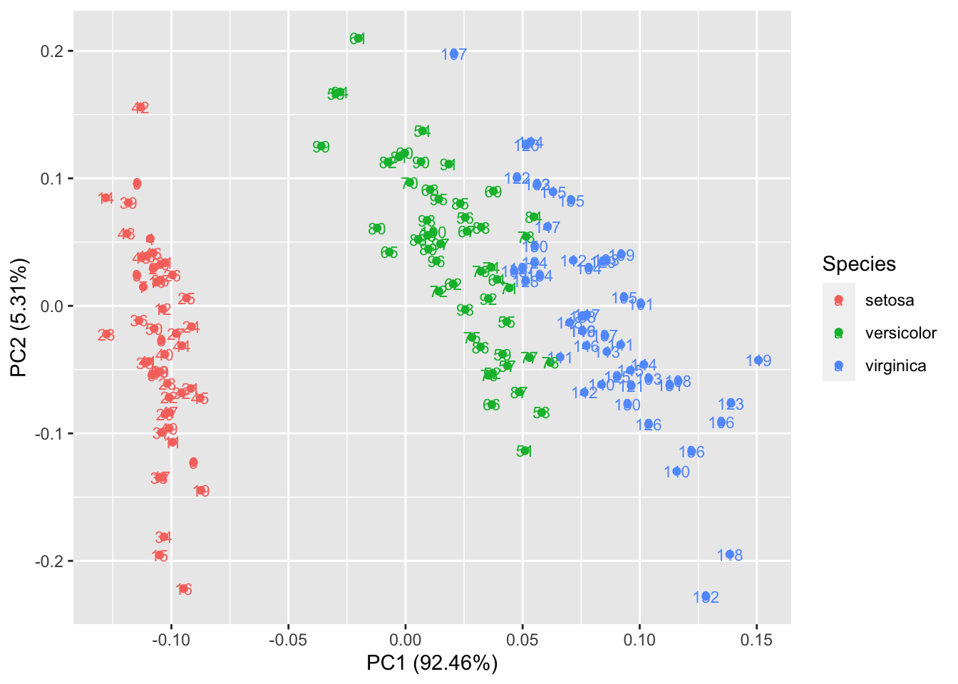 autoplot(prcomp(df), data = iris, colour = 'Species', label = TRUE,label.size = 3)