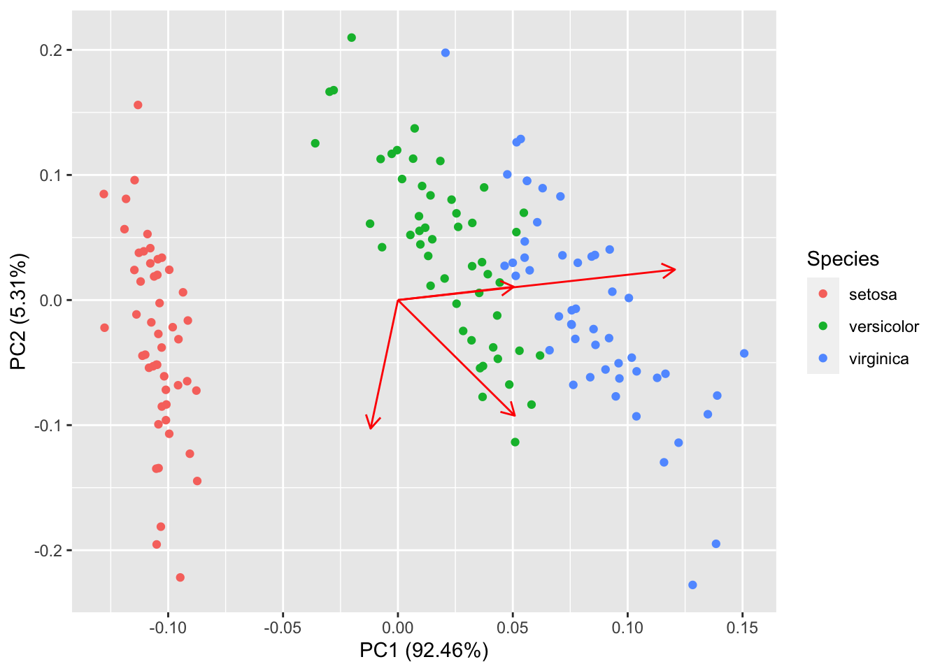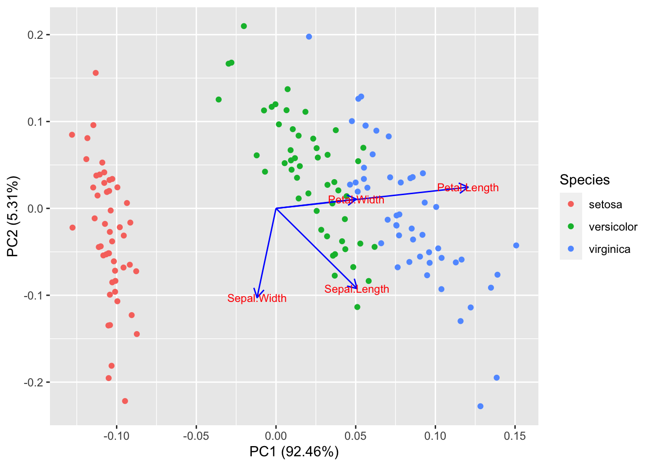 autoplot(prcomp(df), data = iris, colour = 'Species', loadings = TRUE)