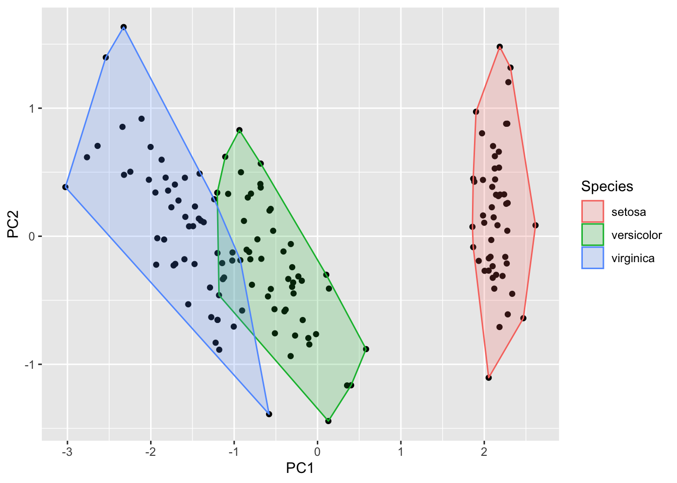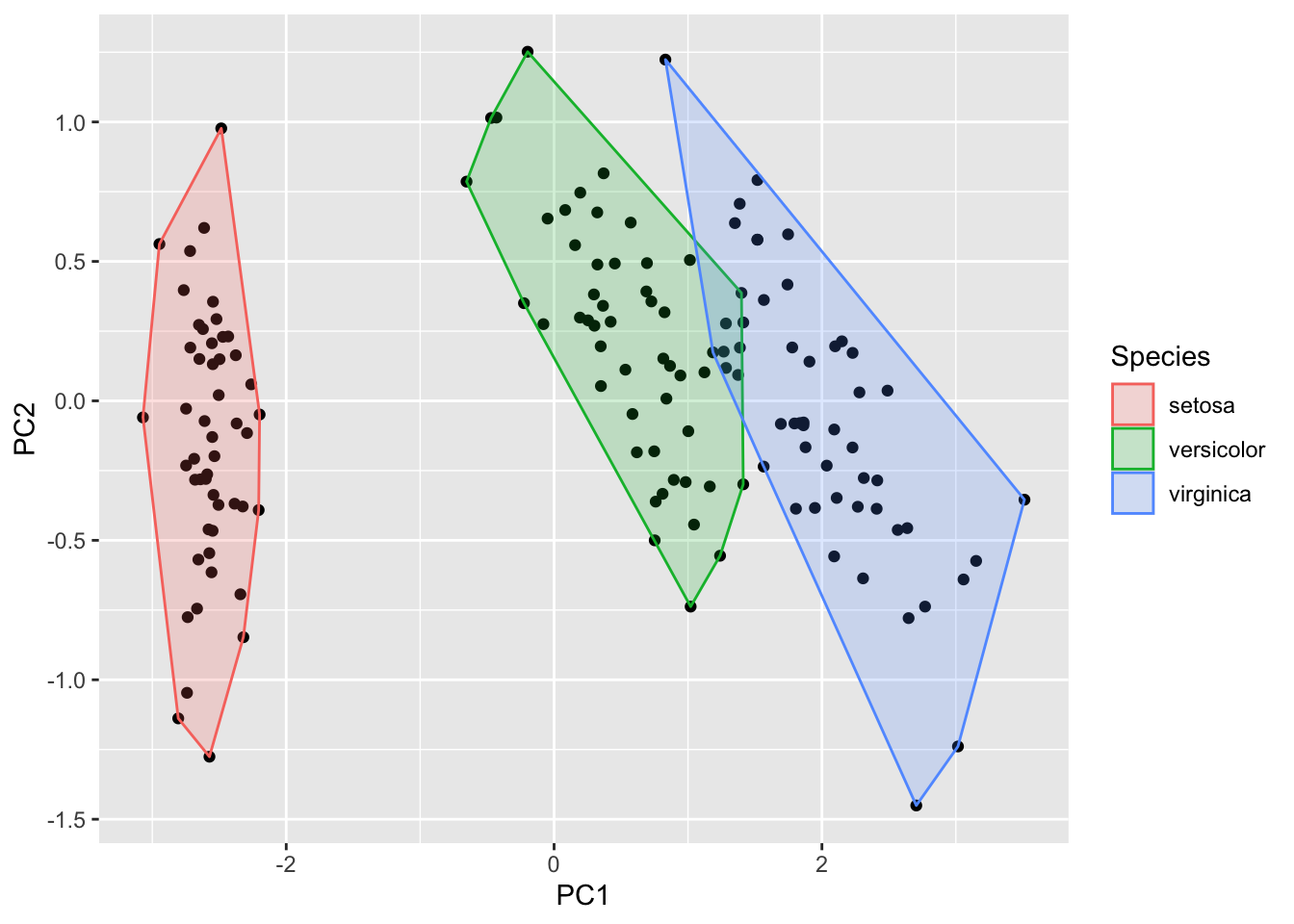 autoplot(model, data = iris, frame = TRUE, frame.colour = 'Species')