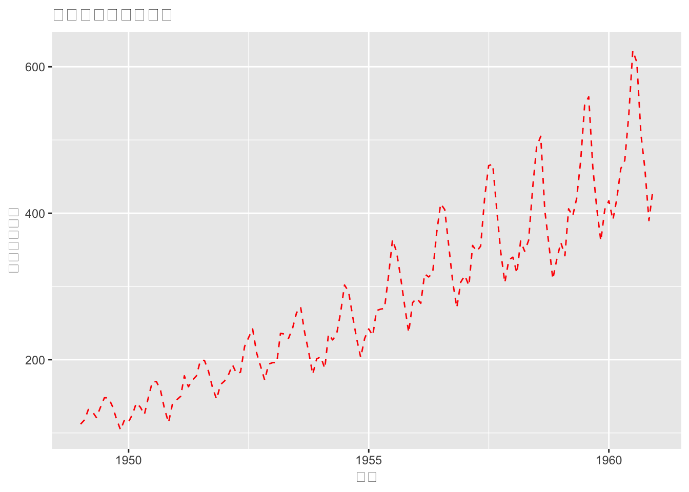autoplot(AirPassengers, ts.colour = 'red', ts.linetype = 'dashed')+xlab("时间")+ylab("飞机乘客数量")+ggtitle( "飞机乘客人数的变化")