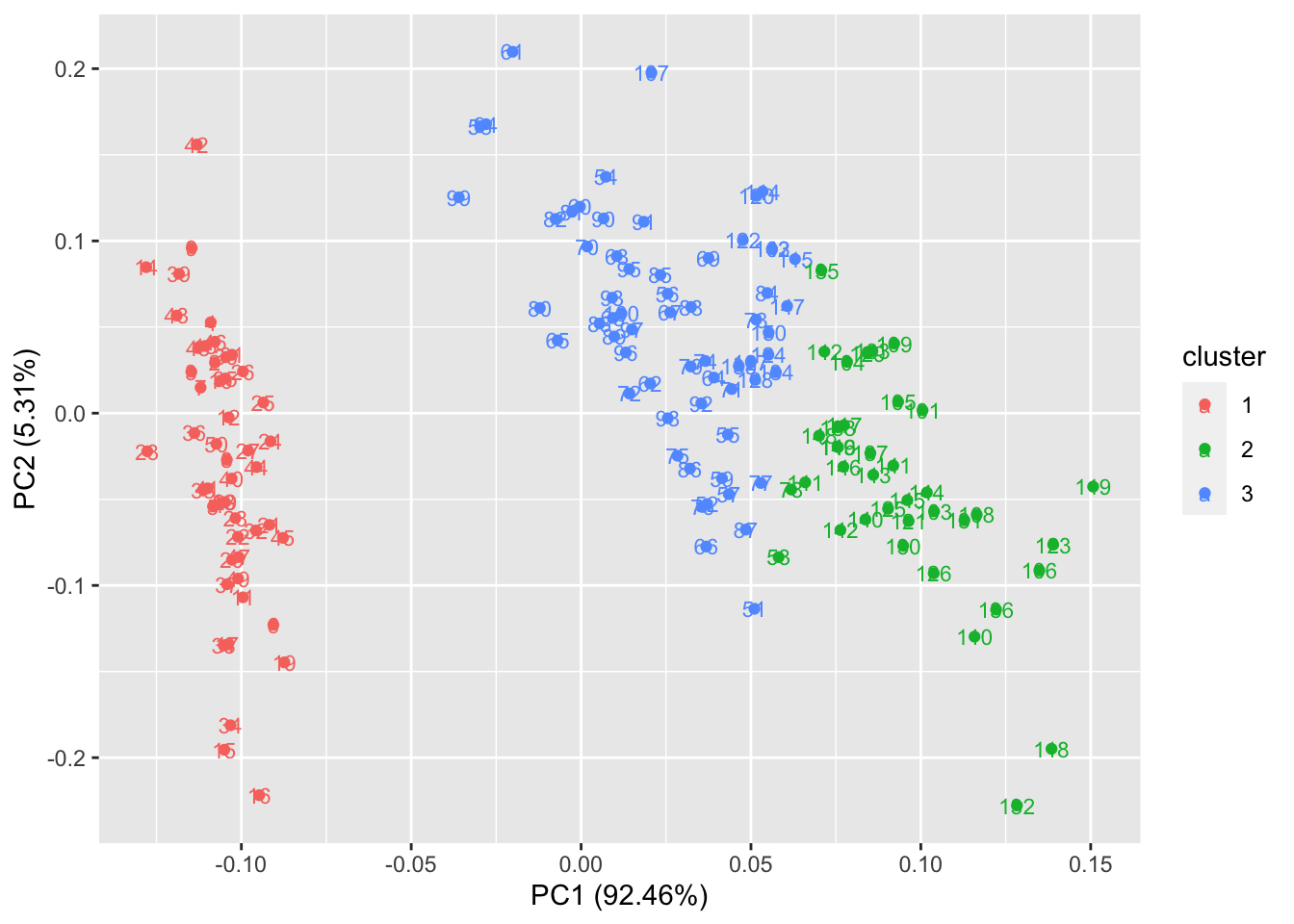 autoplot(kmeans(iris[,-5], 3), data = iris, label = TRUE, label.size = 3)