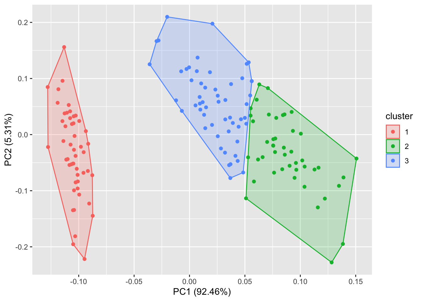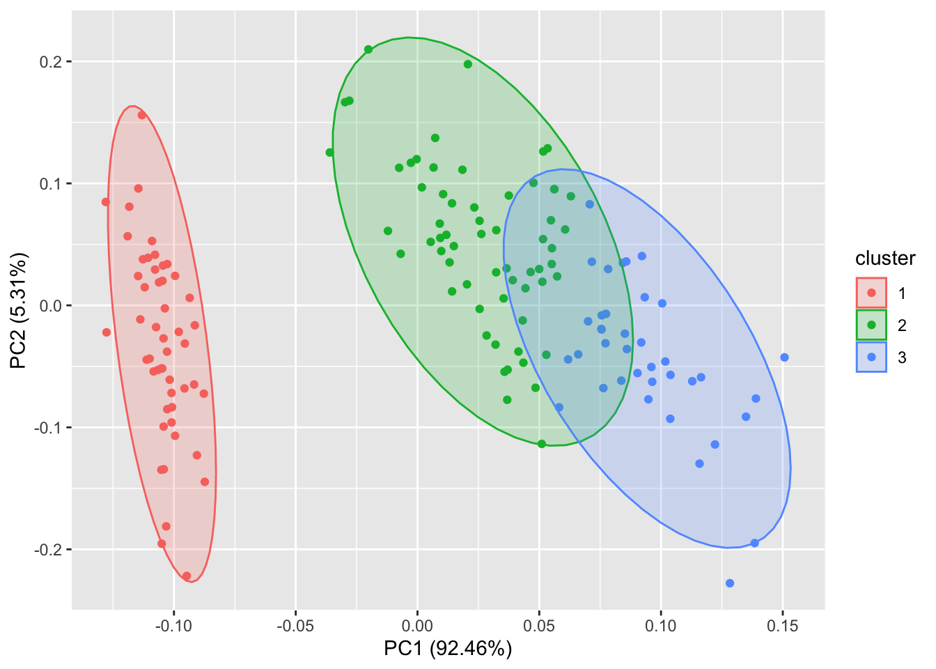 autoplot(pam(iris[-5], 3), frame = TRUE, frame.type = 'norm')#你也可以通过 frame.type 来选择圈的类型。更多选择请参照ggplot2::stat_ellipse里面的frame.type的type关键词。