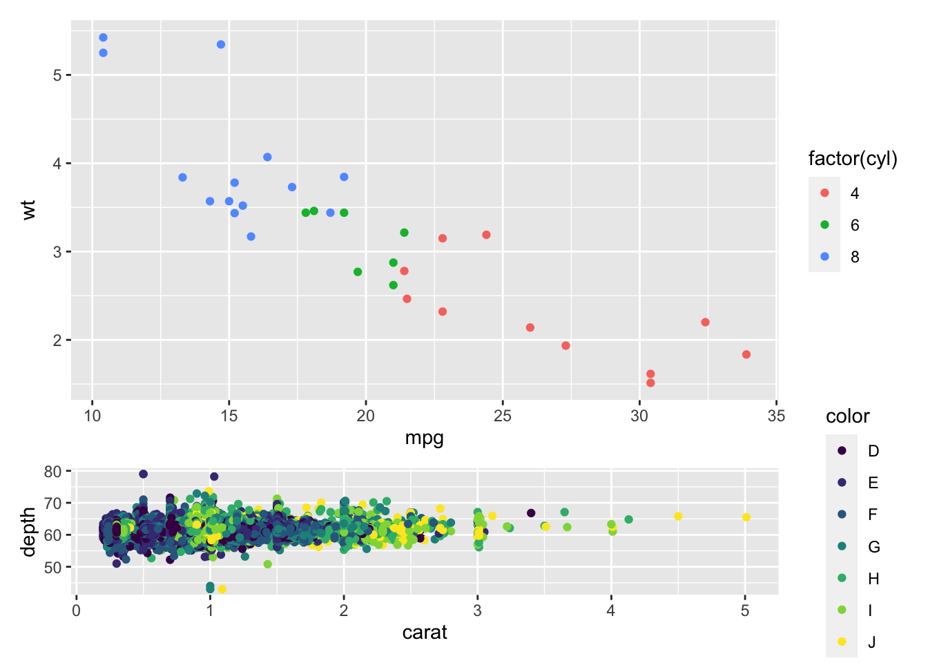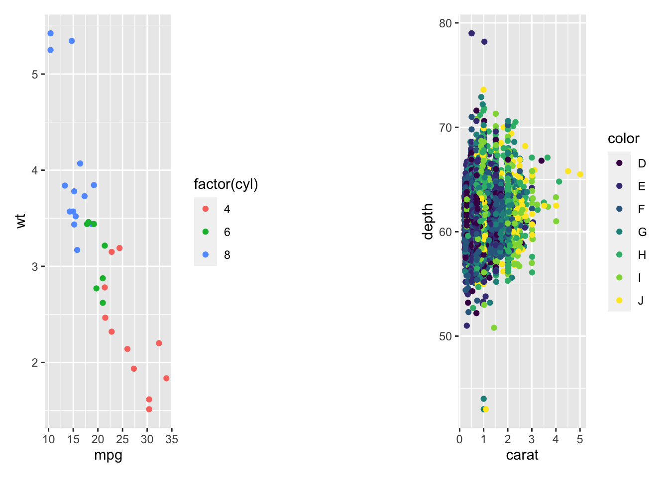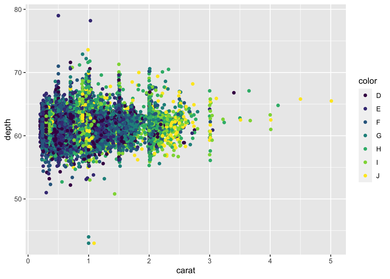 p2 <- ggplot(diamonds, aes(carat, depth, colour = color)) + geom_point()