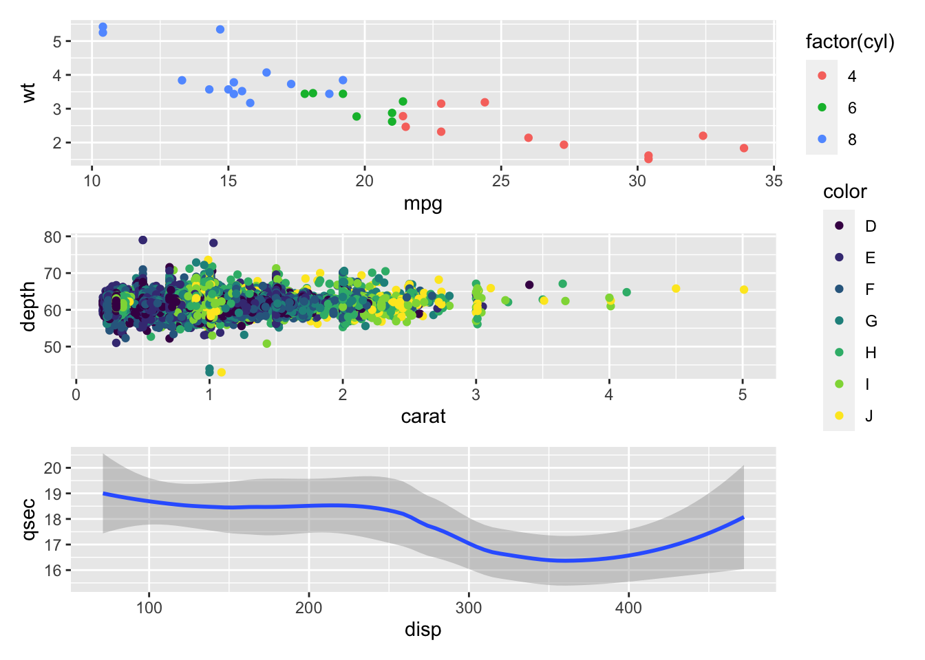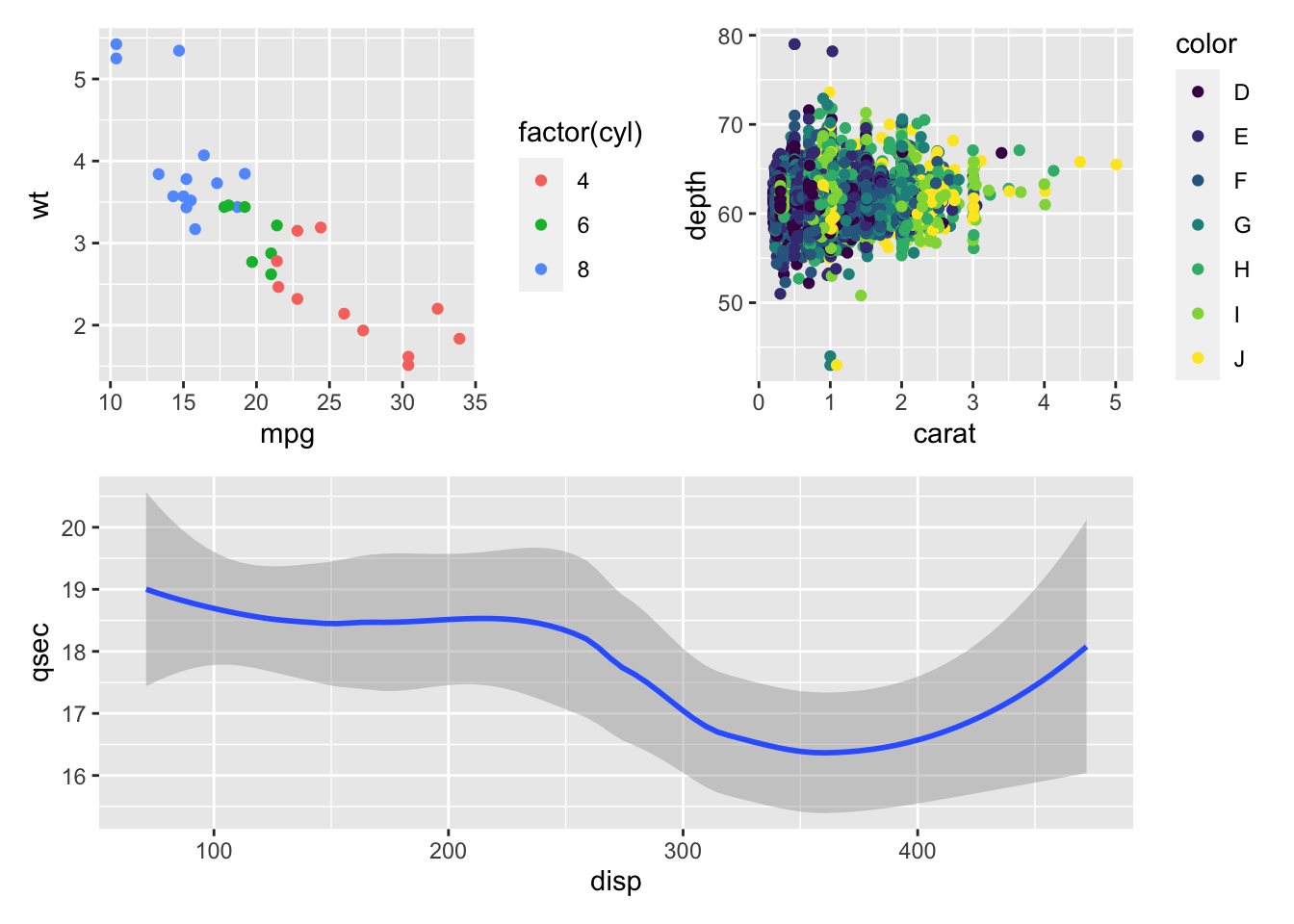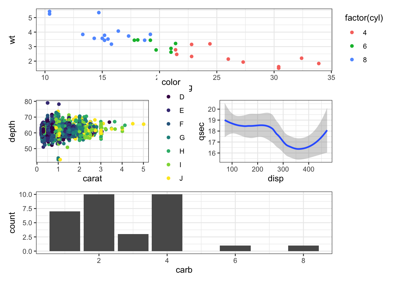 ggplot(diamonds, aes(carat, depth, colour = color)) + geom_point()# 默认的页面布局是1行多列
